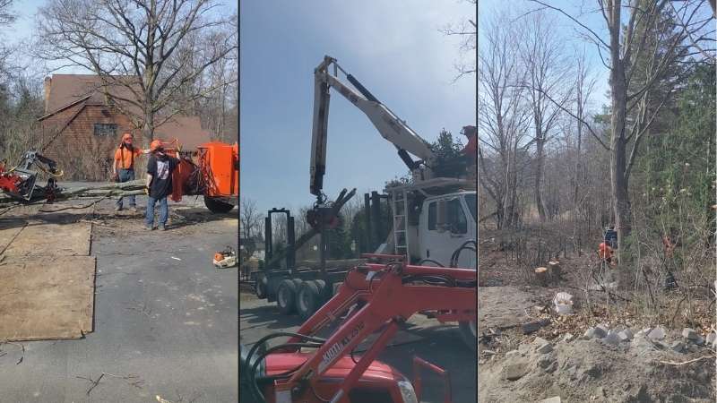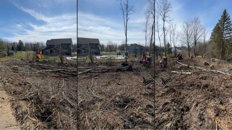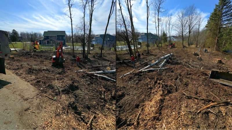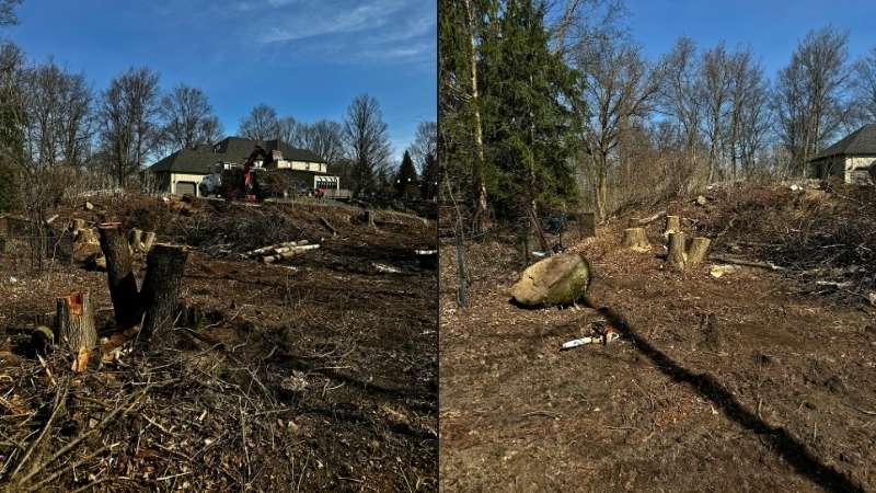 We started by removing several large trees, including two pines and multiple maples, along with their stumps. Logging equipment and forestry attachments helped us safely clear the marked trees while mulching the smaller shrubs and overgrowth. All stumps and leftover debris were pulled out and hauled away.